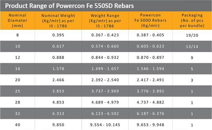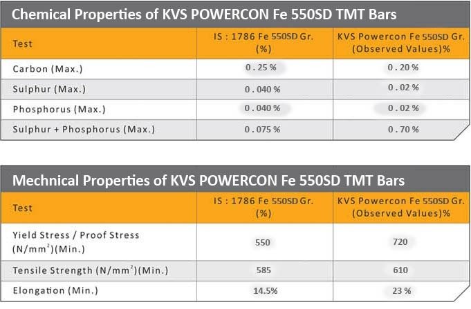 KVS Powercon TMT BARS are in full conformity with IS : 1786:2008 Grade Fe500 / 550D and Fe 550 / 550SD TMT Bar specifications.