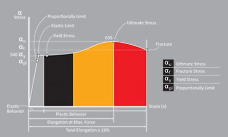 Ductility is a property which helps in elongation of TMT Bar and prevents it from snapping abruptly. KVS Powercon TMT Bars have the rare combination of high strength with ductility. Elongation along with its Yield stress / Proof Strees [Uy] of a steel rebar plays a major role in its ductility. Elongation of a Steel TMT Bar refers to ability to elongate before failure. It is an ultimate stress / deformation [Um] at fracture. Yield stress corresponds to the Yield Strength [Fy] : which is maximum load that an element can undertake. UTS or Ultimate Tensile Strength defined as ultimate stress a material can withstand, defines the ductility for the material. Studies prove a higher tensile strength in TMT Bars result in less consumption of steel.