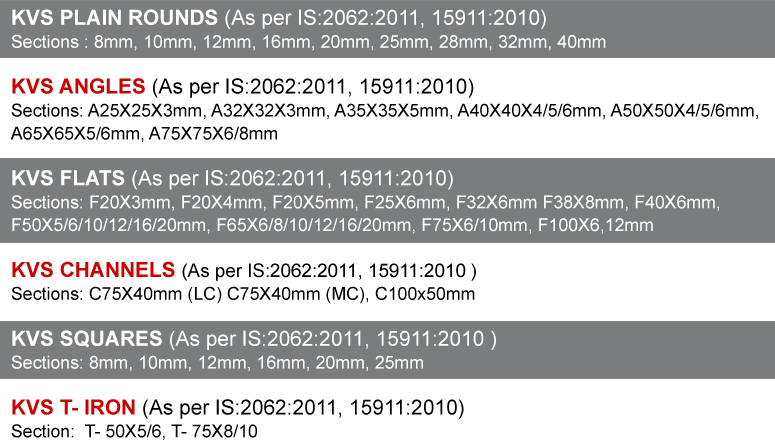 KVS Powercone group is endeavoring in manufacturing Construction Steel & Structural Sections as per BIS Specifications 2830:2012, 2831:2012, 1786:2008, 2062:2011, 15911:2010